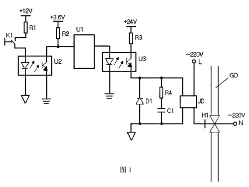 所述**光耦U2的正輸入端依次串接一定量控制開關(guān)K1、一分壓電阻RI到12V正電源,其負(fù)輸入端連接負(fù)電源,其負(fù)輸出端接地;