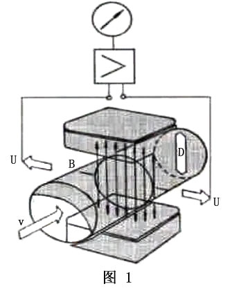 如圖1所示,在一內(nèi)徑為D,內(nèi)部磁場(chǎng)強(qiáng)度為B的非導(dǎo)磁性測(cè)量管內(nèi),液態(tài)的具有導(dǎo)電性被測(cè)介質(zhì)以v的速度流動(dòng),則在與流動(dòng)方向垂直的方向上產(chǎn)生與流量成比例的感應(yīng)電勢(shì)U,該電勢(shì)的大小如下