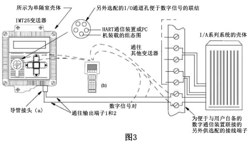 導管走向向下避免水分積聚在接線盒中。任何不用的導管開口都應加以悶塞。HART通信裝置或裝載在PC機上的組態(tài)器可以連接在變送器現(xiàn)場接線端到外部負載之間的任何位置,或連接到另外配供的IO孔口上。如圖3所示;
