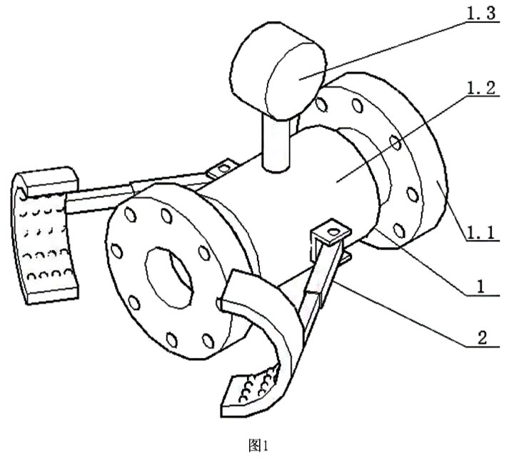 圖中標(biāo)號:電磁流量計主體-1;法蘭盤-1.1;測量導(dǎo)管-1.2;轉(zhuǎn)換器-1.3;定位裝置-2;U型連接組件-2.1;可轉(zhuǎn)動伸縮桿-2.2;夾持弧形件-2.3;滾珠-2.3.1。