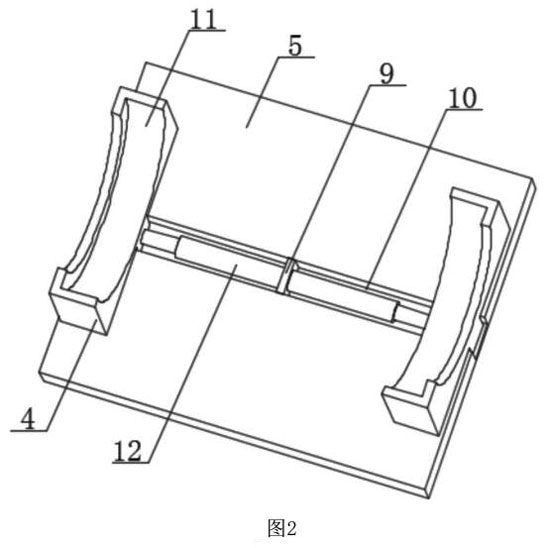 如圖1-5所示,優(yōu)選的,清洗座5的頂部開設(shè)有放置槽10,放置槽10的內(nèi)壁中部固定安裝有固定分隔板9,固定分隔板9的底部與放置槽10的內(nèi)壁底部相貼合,固定分隔板9外壁左右兩側(cè)面固定連接有電動(dòng)伸縮桿12,每個(gè)電動(dòng)伸縮桿12的伸縮端固定連接有支撐板4,每個(gè)支撐板4的頂部開設(shè)有定位弧形槽11,電磁流量計(jì)本體6外壁兩端與貫穿槽8的內(nèi)壁相貼合,電動(dòng)伸縮桿12能夠?qū)χ伟?的位置進(jìn)行調(diào)整,進(jìn)而方便支撐板4對(duì)電磁流量計(jì)本體6進(jìn)行夾持,同時(shí)通過定位弧形槽11對(duì)電磁流量計(jì)本體6進(jìn)行固定,方便對(duì)電磁流量計(jì)本體6進(jìn)行清洗。