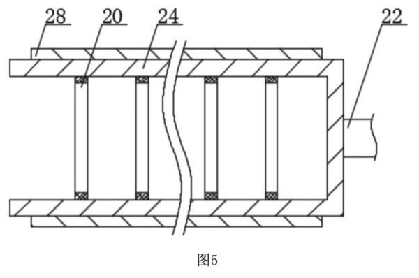 如圖1-5所示,在實(shí)施例1的基礎(chǔ)上,本發(fā)明提供一種技術(shù)方案:優(yōu)選的,增高板7的頂部開設(shè)有凹槽27,凹槽27的內(nèi)壁固定連接有固定桿26,固定桿26的外壁滑動(dòng)連接有安裝座23,安裝座23的底部與凹槽27的內(nèi)壁底部滑動(dòng)連接,安裝座23能夠通過固定桿26進(jìn)行穩(wěn)定地滑動(dòng),從而方便安裝座23進(jìn)行移動(dòng),凹槽27的內(nèi)壁開設(shè)有貫穿槽8,安裝座23的外壁前后兩側(cè)面固定連接有推動(dòng)桿25,推動(dòng)桿25外壁與貫穿槽8的內(nèi)壁滑動(dòng)連接,推動(dòng)桿25能夠用手來進(jìn)行推動(dòng),從而能夠使安裝座23進(jìn)行左右移動(dòng),進(jìn)而方便對(duì)安裝座23的位置進(jìn)行調(diào)整,安裝座23的頂部固定安裝有驅(qū)動(dòng)電機(jī)22,驅(qū)動(dòng)電機(jī)22的驅(qū)動(dòng)端固定連接有U型清洗架24,U型清洗架24的外壁固定安裝有清理刷28,清理刷28的外壁與電磁流量計(jì)本體6的內(nèi)壁相貼合,U型清洗架24的內(nèi)壁固定安裝有若干個(gè)穩(wěn)固環(huán)20,通過啟動(dòng)驅(qū)動(dòng)電機(jī)22帶動(dòng)U型清洗架24進(jìn)行轉(zhuǎn)動(dòng),使U型清洗架24上的清理刷28對(duì)電磁流量計(jì)本體6內(nèi)部的水垢進(jìn)行清洗,穩(wěn)固環(huán)20能夠?qū)型清洗架24進(jìn)行加固,從而使U型清洗架24在進(jìn)行轉(zhuǎn)動(dòng)的過程中,能夠避免U型清洗架24在轉(zhuǎn)動(dòng)的過程中出現(xiàn)變形。