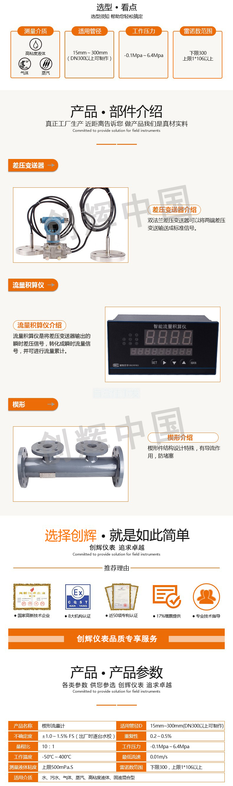 (2)可測(cè)量腐蝕性介質(zhì),由于差壓測(cè)量是采用隔膜式的雙法蘭差壓變送器,腐蝕性介質(zhì)不能進(jìn)入導(dǎo)壓管和差壓變送器,所以我公司采用耐腐蝕性材料加工楔形節(jié)流件,就能使儀表對(duì)腐性介質(zhì)進(jìn)行測(cè)量。
