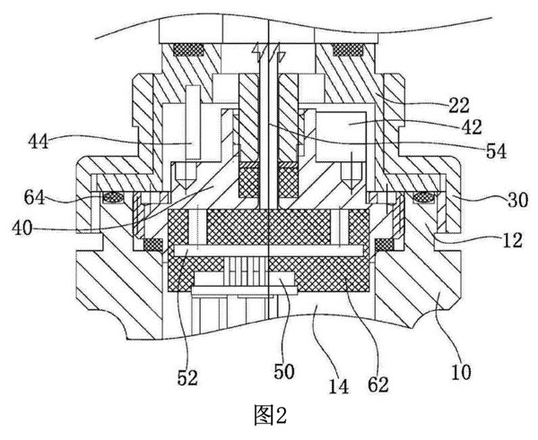 圖中各個(gè)標(biāo)號(hào)統(tǒng)一說(shuō)明如下:10、殼體:12、聯(lián)接頭:14、流體通道:20、表頭22、表頭聯(lián)接座:30、聯(lián)接蓋:40、傳感器座:42、防轉(zhuǎn)動(dòng)片:44、防轉(zhuǎn)動(dòng)軸:50、差壓傳感器52、電路板:54、通孔:62、密封膠:64、密封圈。