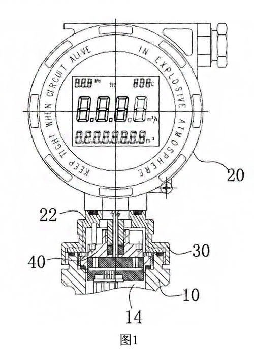 請(qǐng)參見(jiàn)圖1、圖3,本實(shí)施例的一種可防表頭過(guò)度旋轉(zhuǎn)的流量計(jì),包括表頭20和殼體10,表頭20與売體10通過(guò)聯(lián)接蓋30連接,殼體10內(nèi)設(shè)有流體通道14,在流體通道14內(nèi)設(shè)有差壓傳感器50,差壓傳感器50通過(guò)電線與表頭20連接,差壓傳感器50將數(shù)據(jù)信號(hào)通過(guò)電線傳輸至表頭20內(nèi),通過(guò)表頭內(nèi)安裝的數(shù)據(jù)處理單元和顯示單元分別將傳感器輸送過(guò)來(lái)的信號(hào)進(jìn)行處理和顯示。