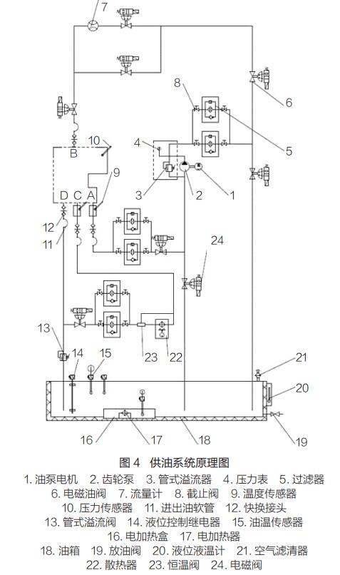 試驗(yàn)臺(tái)供油系統(tǒng)用于提供變速器試驗(yàn)所需的油壓和流量,保證油溫處于變速器的正常工作范圍內(nèi)。供油系統(tǒng)原理如圖 4 所示。通過(guò)計(jì)算機(jī)控制系統(tǒng)控制,可實(shí)現(xiàn)變速器試驗(yàn)全過(guò)程油液循環(huán)過(guò)濾、保溫、濾清器堵塞報(bào)警等功能。