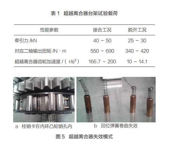 在試驗(yàn)臺(tái)上模擬渦街流量計(jì)常見(jiàn)工況的傳動(dòng)系載荷譜,臺(tái)架試驗(yàn) 1h 等效于整機(jī)試驗(yàn) 1.8h。利用試驗(yàn)臺(tái)進(jìn)行了 4 次累計(jì)600h 的試驗(yàn),超越離合器失效模式如圖 5 所示。超越離合器失效主要表現(xiàn)為柱銷卡死在內(nèi)環(huán)凸輪銷孔中,彈簧卷曲、斷裂,以及內(nèi)環(huán)凸輪滾道壓痕明顯,與市場(chǎng)反饋的失效模式基本一致。該試驗(yàn)臺(tái)對(duì)市場(chǎng)故障具有很好的再現(xiàn)性,極大縮短了故障驗(yàn)證時(shí)間,減少了整機(jī)試驗(yàn)時(shí)的排放和噪聲污染,具有良好的經(jīng)濟(jì)效益和社會(huì)效益?!?/span>