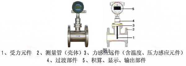數(shù)顯靶式流量計(jì)主要由測量管(殼體),受力元件,感應(yīng)元件(力傳感器,壓力傳感器,溫度傳感器),過渡部件(根據(jù)溫度,壓力而增減),積算顯示和輸出部分,其結(jié)構(gòu)如下圖