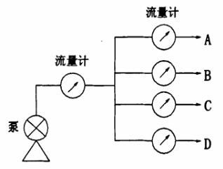 因加工不合格水煤漿的顆粒較大容易堵塞噴槍,小鍋爐大部分采用一臺“螺桿泵”加壓帶一只噴槍,用壓力或流量檢測噴槍堵塞都好解決。但大鍋爐用8~12只噴槍,如圖所示,若A槍半堵塞時,因B、C、D槍在繼續(xù)噴射,壓力變送器則檢測不到A槍是否在正常工作,在此情況下易造成爐膛燃燒點(diǎn)不均勻,影響鍋爐的正常工作。若A槍全堵塞,因B、C、D槍在繼續(xù)噴射,所以A槍壓力的突然變化量很小(壓力信號本身也存在上下的微小波動),DCS很難做出準(zhǔn)確判斷,故用壓力變送器很難達(dá)到預(yù)想的效果。若用流量計檢測,流量計輸出信號送到DCS,利用其編程可以完全檢測到噴槍堵塞狀況并報警提示,以便及時清洗噴嘴。